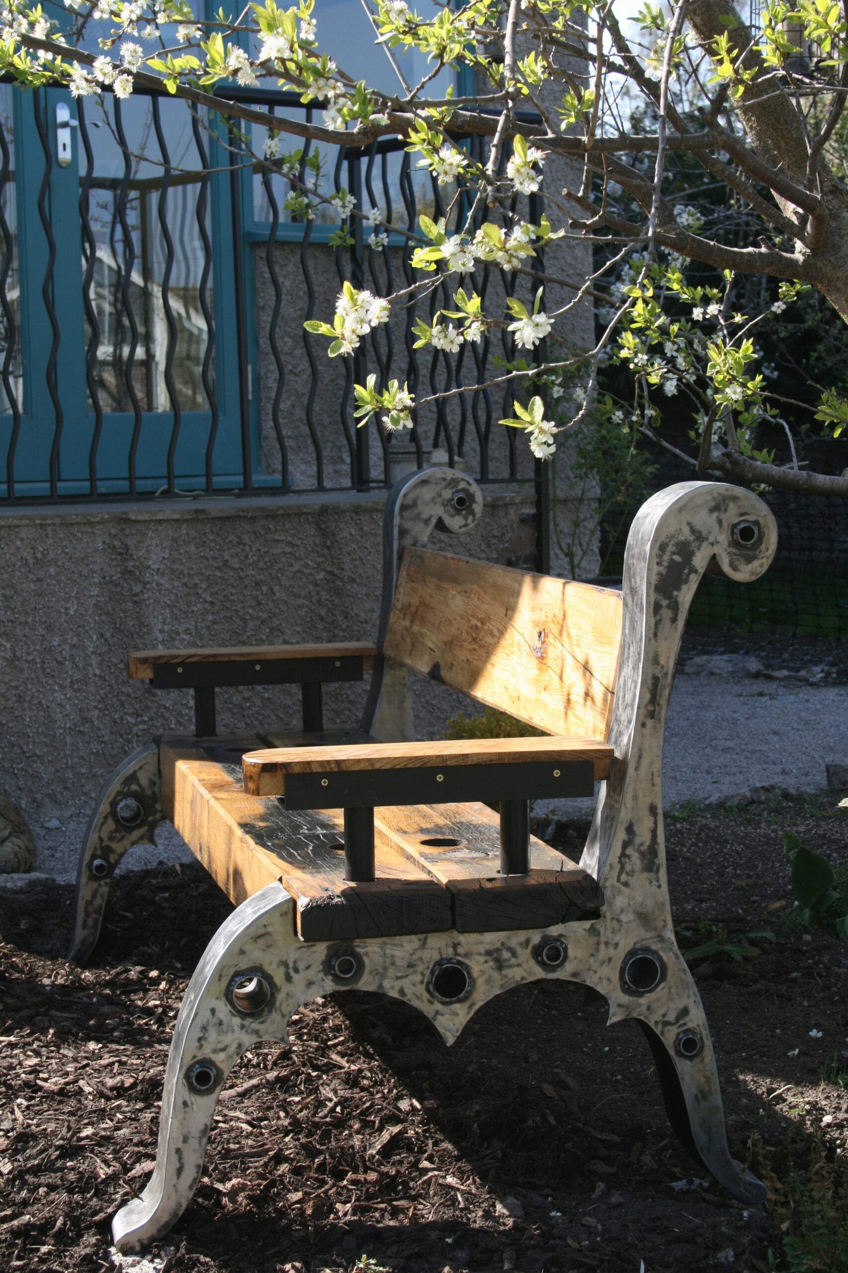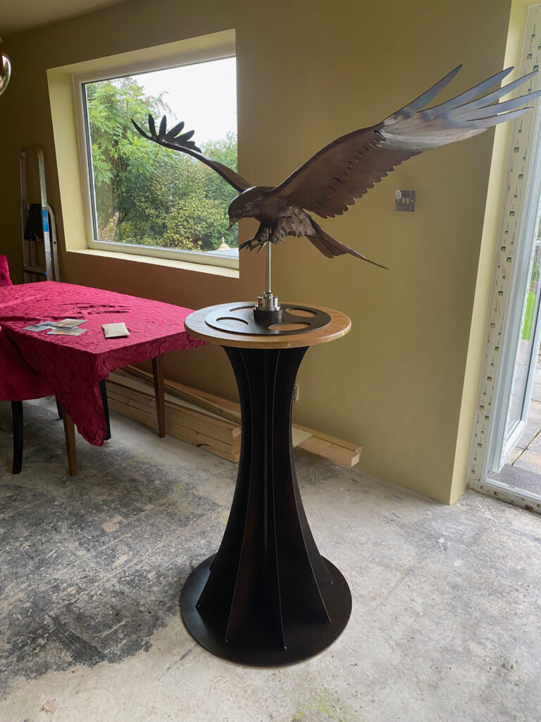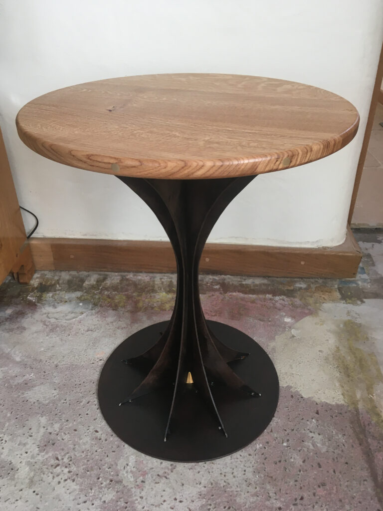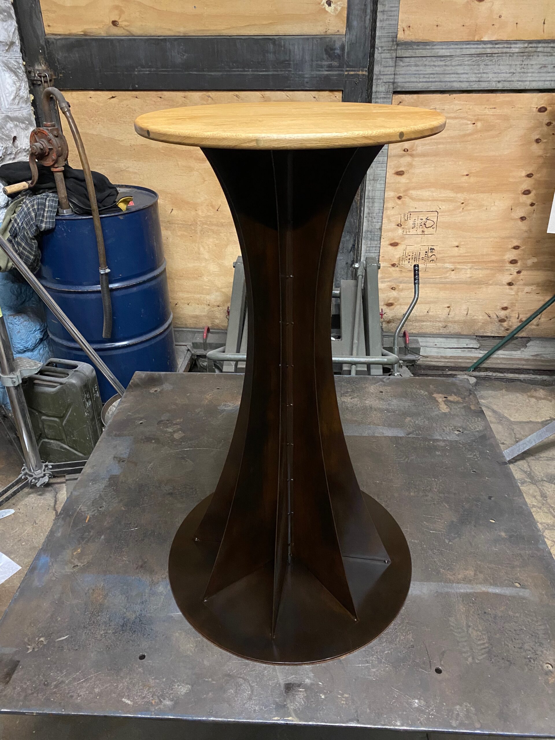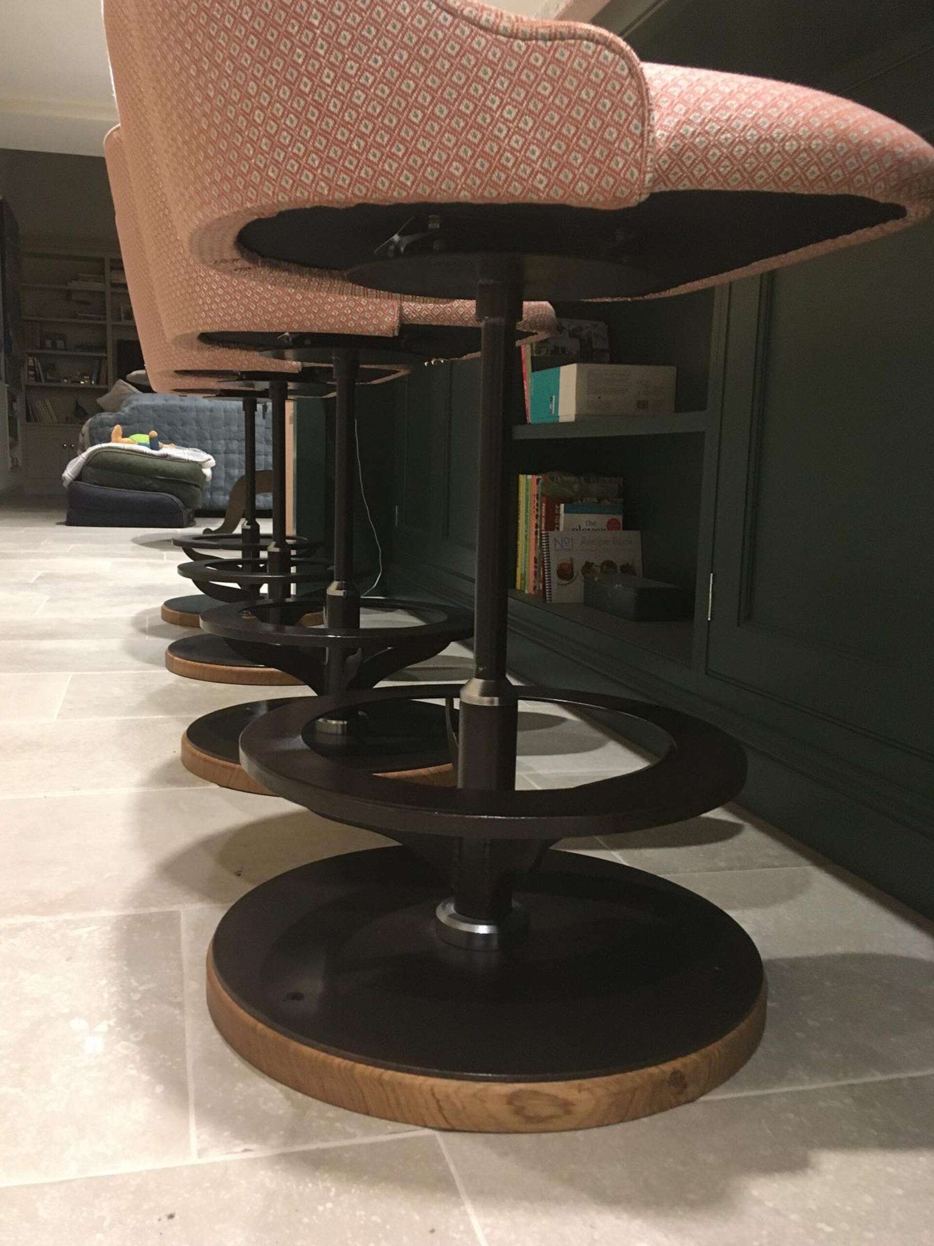 Four bar stools commissioned for a new kitchen with island. Machined and patinated steel, stainless steel details, sprung return seat pivot and English oak base. The seat is a traditional style and formed with laminated aircraft plywood. Beautifully upholstered by GW Interiors.